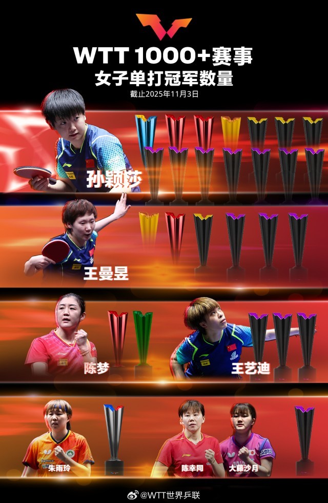 祝贺!WTT1000+冠军榜孙颖莎王楚钦继续领跑