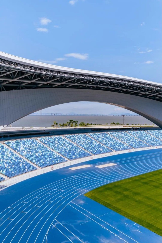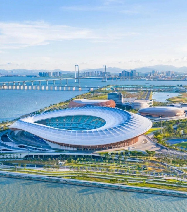 其一大亮点在于综合体育场馆的设计:通过宽约145米、高约22米的大拱架构,巧妙地构筑出“边看比赛边看海”的独特视野。观众于席间可远眺深圳前海、深中通道与无垠大海。