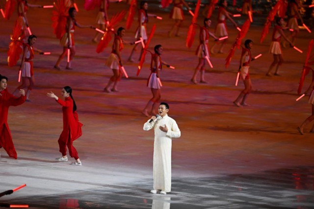 当《海阔天空》的旋律响起,观众席上的数万人自发点亮手机灯光,齐声合唱。象征第十五届全运会的15朵巨型木棉花升空,香港艺人刘德华领唱《中国人》,全场沸腾。