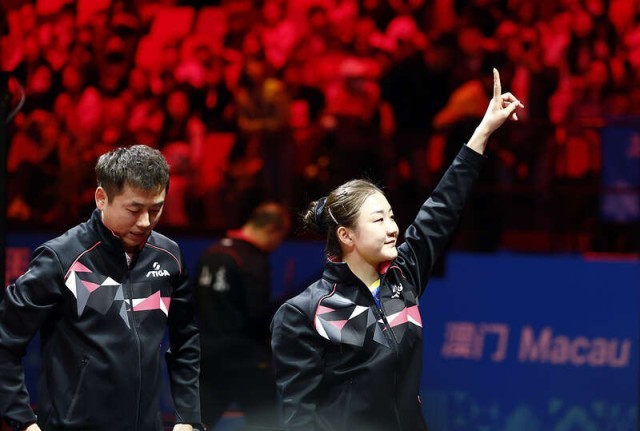 11月19日晚,澳门,第十五届全运会乒乓球女团决赛,山东队战胜河北队夺冠,图为山东队员陈梦在赛后做出“第一”的手势。视觉中国供图