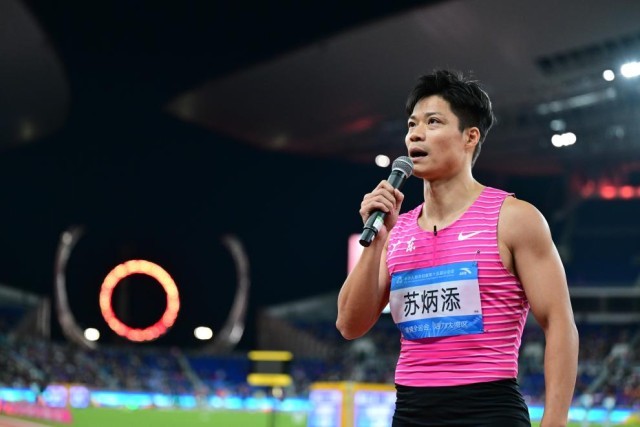 终点处,苏炳添拿起话筒。