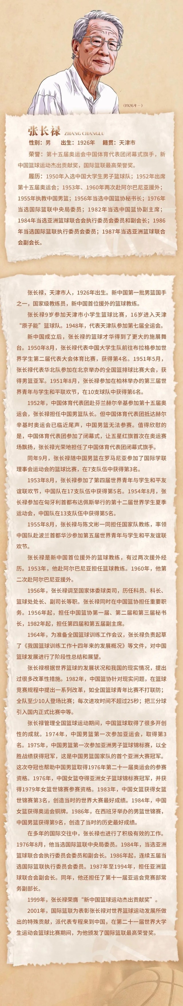 在2022中国篮球名人堂评选中,张长禄成为15名“特别致敬人物”之一。彼时,中国篮球名人堂曾用一张长图致敬这位名宿。