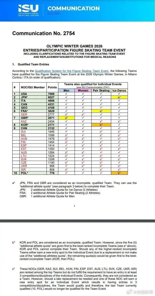2026年米兰冬奥会花样滑冰项目团体赛名额正式出炉!中国获得参赛资格。