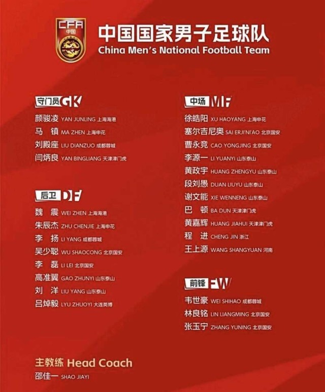 守门员依旧由颜骏凌担纲,马镇、刘殿座在列,天津津门虎门将闫炳良首次入选。