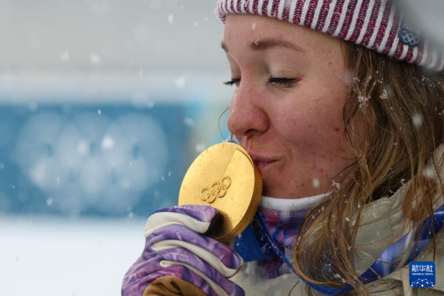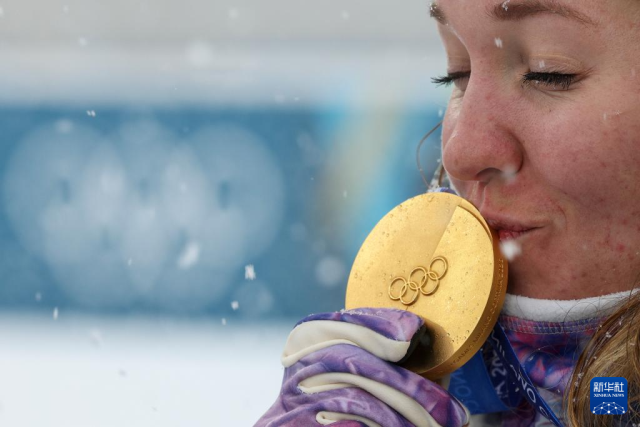 2月21日,冠军法国选手米舍隆在颁奖仪式后亲吻金牌。