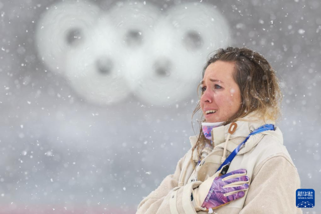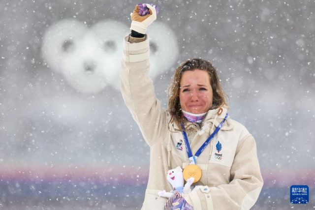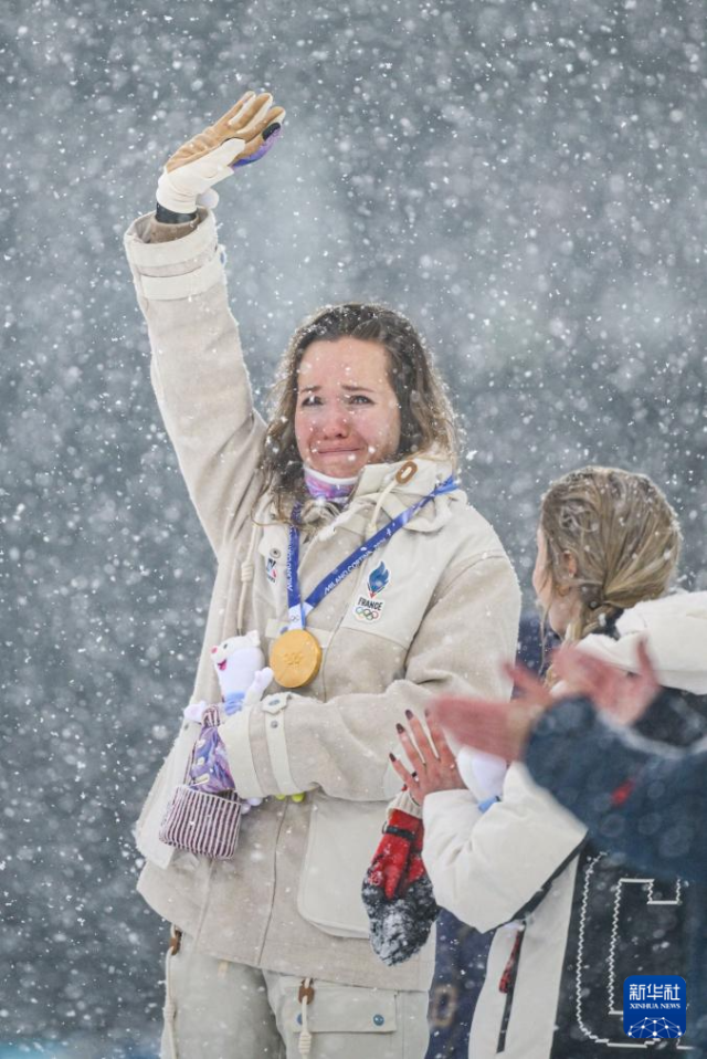 2月21日,冠军法国选手米舍隆在颁奖仪式上流泪。