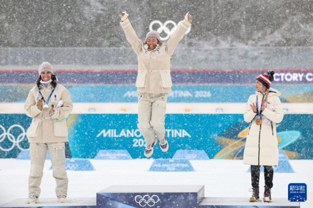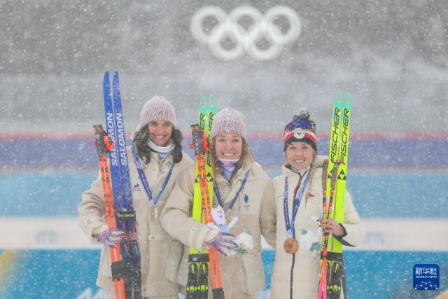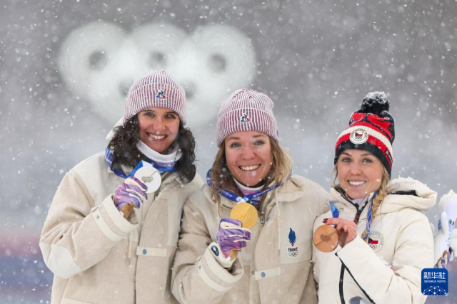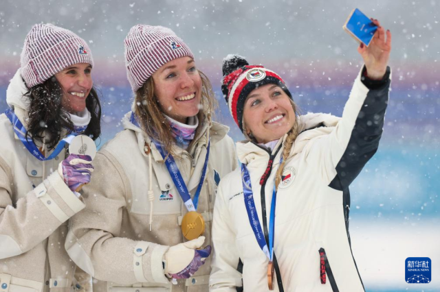 2月21日,冠军法国选手米舍隆(中)、亚军法国选手西蒙(中)和季军捷克选手沃博尔尼科娃在颁奖仪式上自拍。