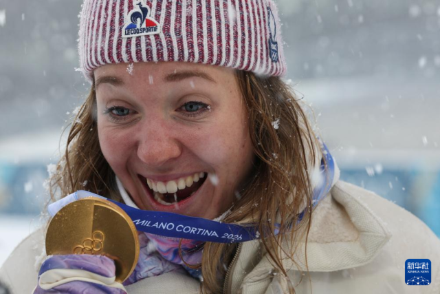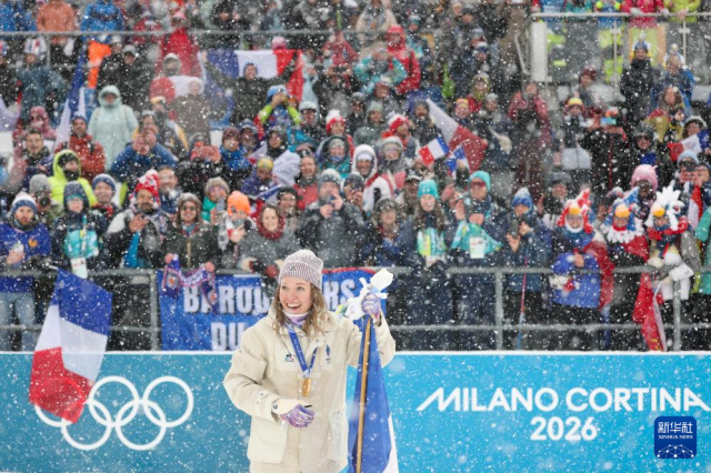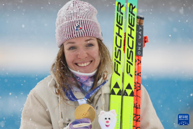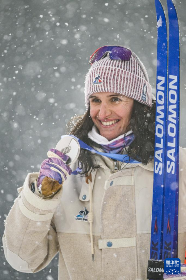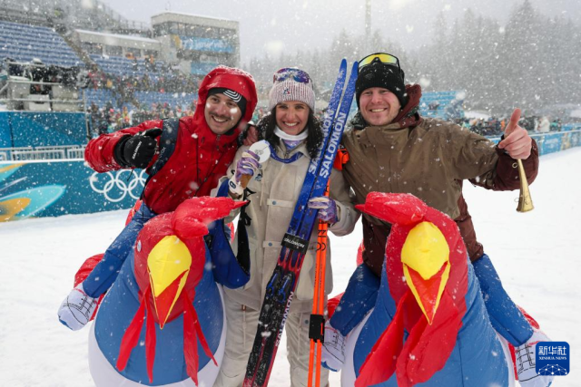 2月21日,法国选手米舍隆在终点处庆祝。她获得冠军。