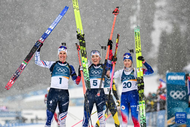 2月21日,冠军法国选手米舍隆(中)、亚军法国选手西蒙(中)和季军捷克选手沃博尔尼科娃在赛后合影。