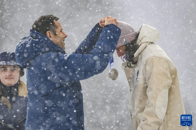 2月21日,冠军法国选手米舍隆(右)在颁奖仪式佩戴金牌。
