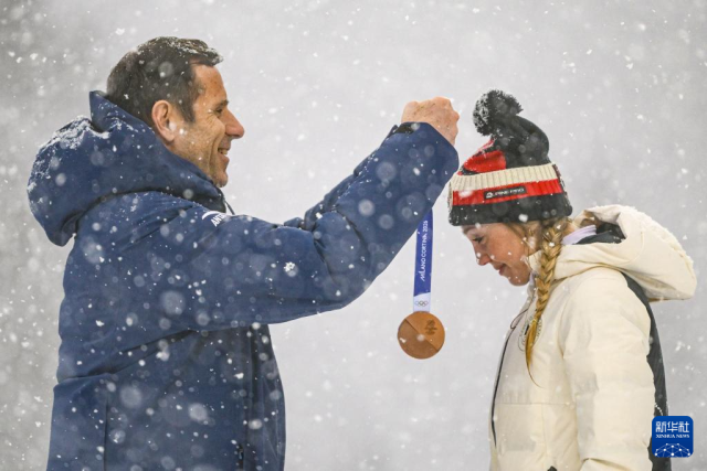 2月21日,季军捷克选手沃博尔尼科娃(右)在颁奖仪式上佩戴奖牌。