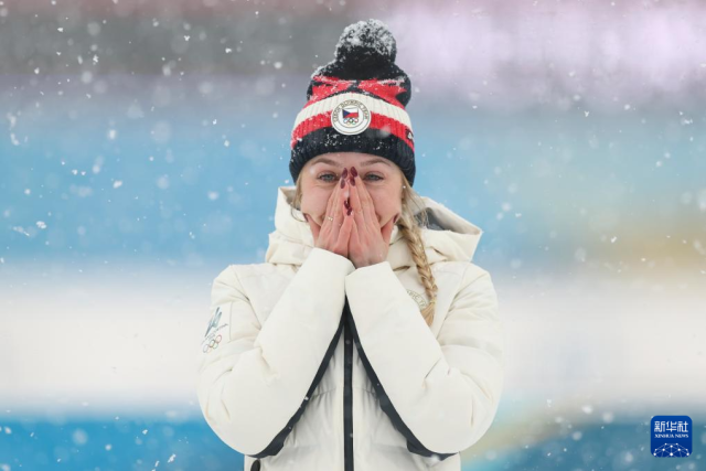2月21日,季军捷克选手沃博尔尼科娃在颁奖仪式上庆祝。