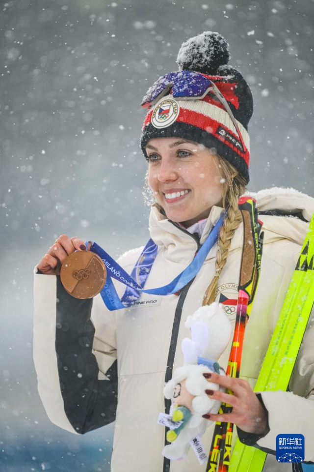 2月21日,季军捷克选手沃博尔尼科娃在颁奖仪式上。