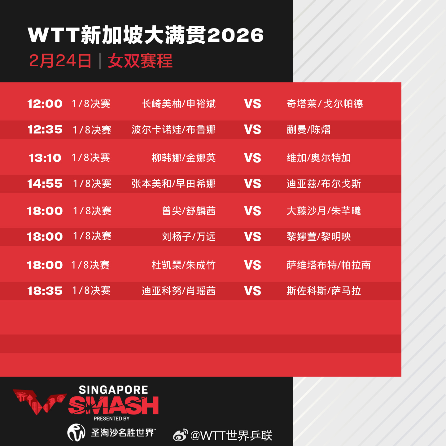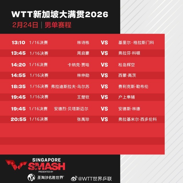 24日,2026年WTT新加坡大满贯进入正赛第三天,林诗栋、王楚钦、王曼昱、蒯曼等出场。具体赛程如下: