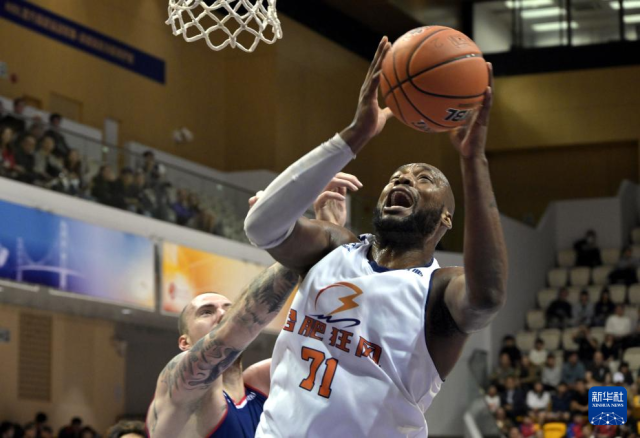 2月24日,合肥狂风队球员阿格拉瓦尼斯(中)在比赛中上篮。