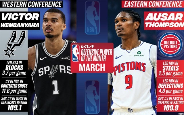 央视网消息:北京时间4月3日,NBA官方公布新一期东西部月最佳防守球员,马刺球星维克托·文班亚马和活塞新星奥萨尔·汤普森分别当选。