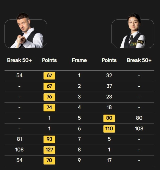 △资格赛第一轮:白雨露10-7丹尼尔·沃默斯利