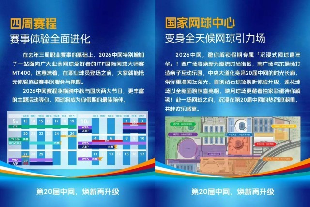 2026年中网赛程将横跨中秋与国庆两大节日,持续四周,在延续三周职业赛事的基础上新增ITF国际网球大师赛MT400,国家网球中心在赛事期间构建“沉浸式嘉年华”,打造时尚潮流街区、亲子乐园和历史长廊,并推出线下会员俱乐部。