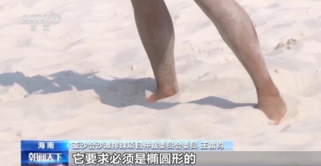 亚沙会沙滩排球项目仲裁委员会委员 王雷钧:这个沙子通过显微镜放大了看,要求必须是椭圆形的,不是尖锐形的。这样才会让运动员放心扑球、倒地救球、鱼跃救球等。