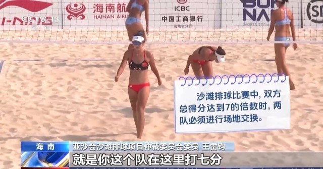亚沙会沙滩排球项目仲裁委员会委员 王雷钧:我们有一个规则叫每到7分交换场地。这个队在这里打7分,然后换到那边去打7分。赛场受阳光、风的影响,所以为了公平要场地交换。比赛是三局两胜制,前两局21分,第三局是15分。