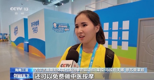 吉尔吉斯斯坦体育代表团攀岩运动员 莱拉·马拉托夫娜·穆苏里莱娃:很喜欢这里,有一个很大的健身房。我们不仅可以加强备战训练,还可以免费做中医按摩。
