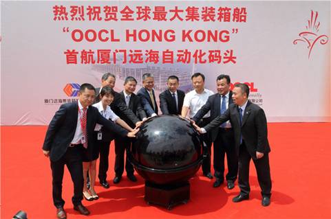 启动仪式上,厦门市副市长李辉跃、厦门市自贸委主任助理曹海波、厦门港口管理局局长吴顺彬、厦门远洋运输公司总经理袁小宇、中远海运港口有限公司副主席兼董事总经理张为、东方海外货柜航运(中国)有限公司董事姚尔欣、厦门远海集装箱码头公司副总经理(主持工作)陈毅鹏、东方海外货柜航运(中国)有限公司厦门分公司总经理张浩、中远海运港口厦门远海全自动化码头“巾帼班组”代表郑逸君上台 ,一同触摸点亮水晶球,共同见证全球最大集装箱首靠中远海运港口厦门远海全自动化码头正式作业。