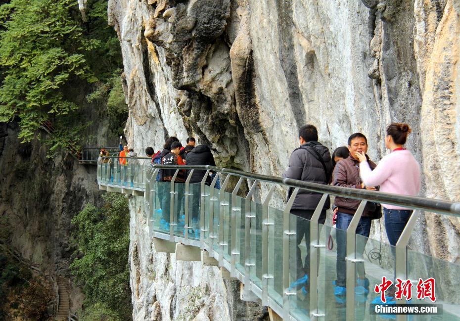 3月24日,地处广西融安县石门仙湖景区的玻璃栈道试运行,数十名游客体验“尝鲜”。该玻璃栈道建在距离谷底达60米的悬崖壁上,下方是石门仙湖山石峻峭的中天坑,全长309.4米、宽1.6米,是目前广西最长的玻璃栈道。 韦荣军 摄