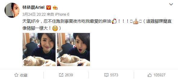 林依晨24日晚间,在微博上晒出两张美照,只见她捧着一碗鸡腿,对着镜头露出满足的笑容,她发文透露自己身在宁夏夜市,“天气好冷,忍不住跑到宁夏夜市吃我最爱的麻油鸡!”然而在第二张照片中,她的盯着该碗麻油鸡,把眼睛、嘴巴都撑得非常大,露出一副惊讶的表情,“这鸡脚踝简直像猪脚一样大!”