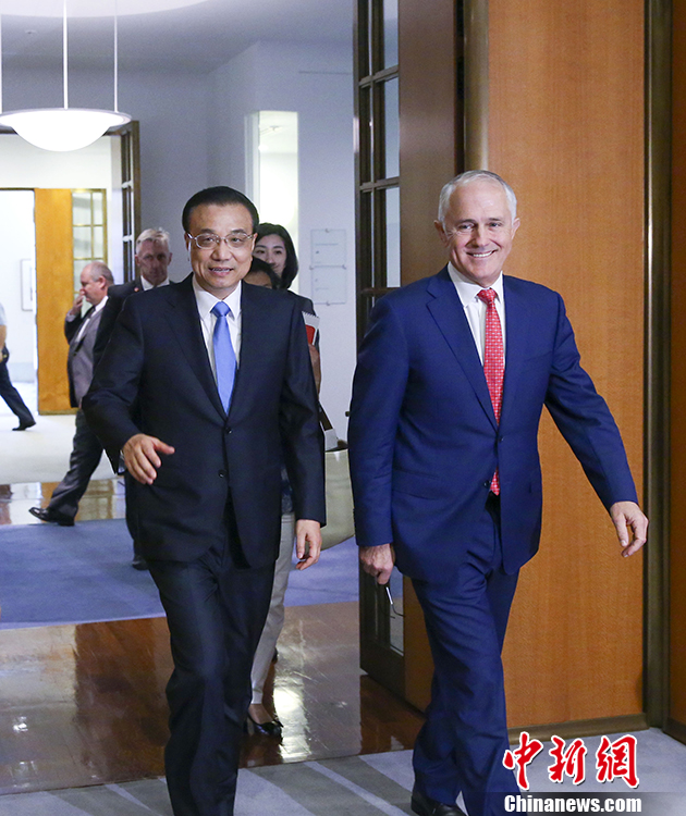 当地时间3月24日上午,中国国务院总理李克强在堪培拉议会大厦同澳大利亚总理特恩布尔举行第五轮中澳总理年度会晤。 中新社记者 刘震 摄